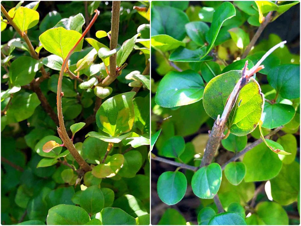木曜だったか金曜だったか、ふと目についた姫ライラックの枝、2ヶ所。花後剪定して結構伸び放題になっているのですが、何だろうこの裂けたような枝は?😱