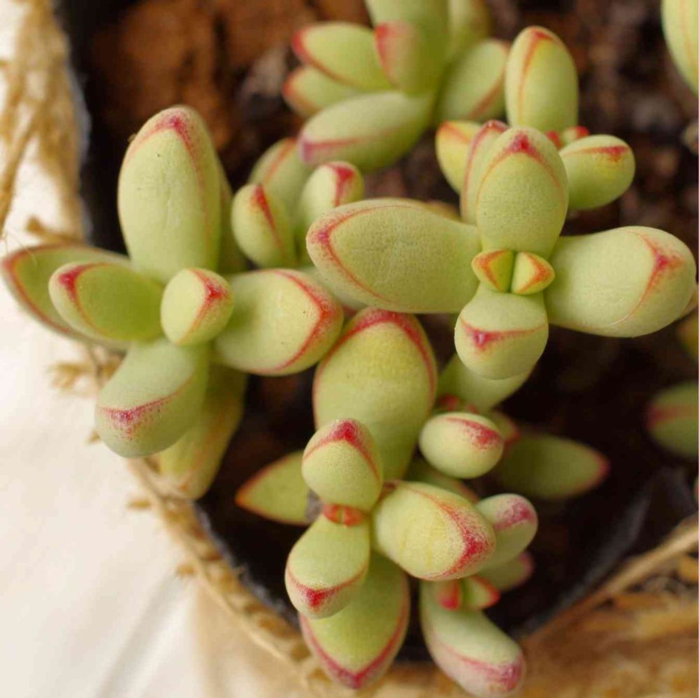 少し角ばったフィンガーチョコレートのように細く丸い葉っぱをムチムチとつけ、冬には先っぽが赤く色づくパキフィツムのような可愛らしさいっぱいのクラッスラ。コチレドンにも雰囲気が似ています。
