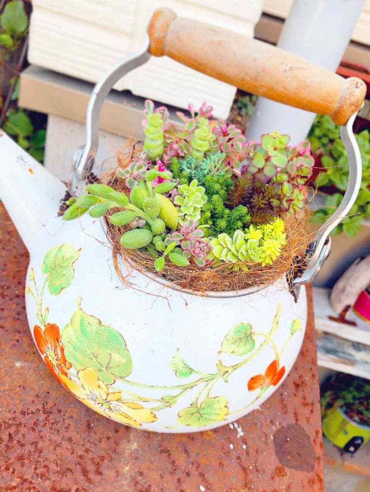 レトロなやかんに寄せ植え💕