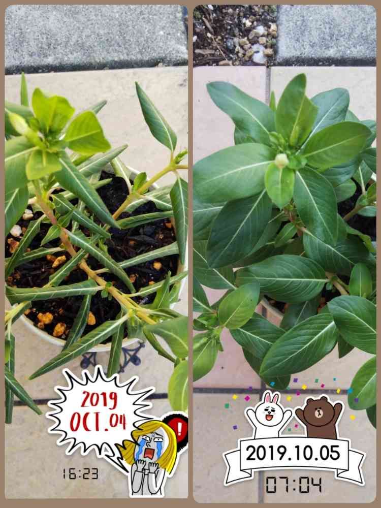これが同じ花か、という感じで、シオシオしたりイキイキしたりを反復横跳びしています…。これは水切れなのか根腐れなのか。「ニチニチソウは過湿を好まない、じつは水やりの難しい花」という情報も見かけたので、様子見つつ様子見つつ慎重に見守っています。今のところ、水やりは朝のみ、土の状態や天気予報によってはパスしたりもしています。日中はやはりシオシオするのですが、夕方気温が落ち着いたらまた持ち直しているので、水やりの頻度はこれでいいのかな……ゴクリ……。という感じです。ニチニチソウなのに(残暑厳しいとはいえ)暑さのピーク過ぎた今の時期の気温に耐えられないの……? と思うと不安でしょうがないんですが、何かできることはあるのでしょうか?