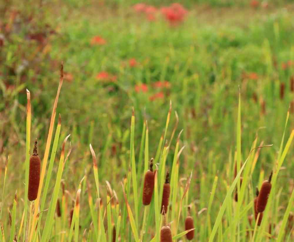 休耕田の田んぼの中にあるガマノホ(蒲の穂)越しにヒガンバナ