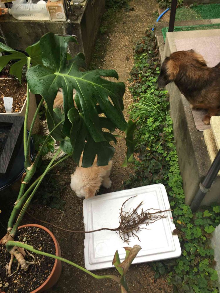 放置組のモンステラ。雨が降るので移動させようとしたら気根からの発根…お2人さん