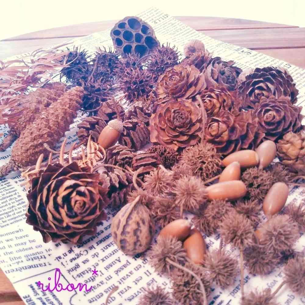 色々な木の実が集まったので、テーブルに広げてみました♡