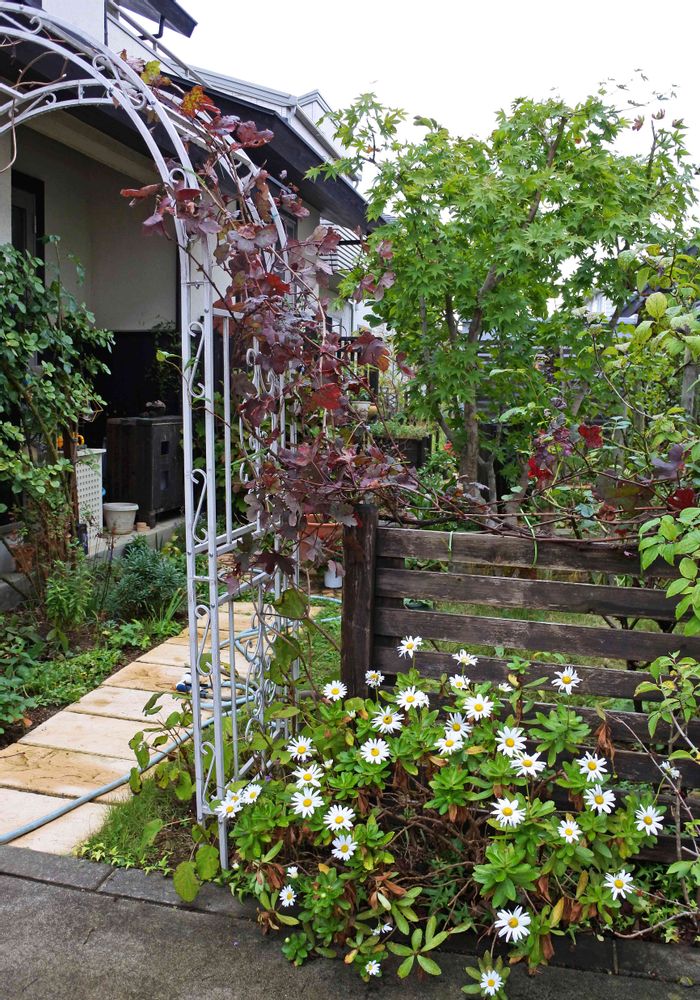先日取り付けた白のアーチとハマギクの白がいい感じです。ヨーロッパブドウをアーチに誘引しなおすのがとても大変だったのですが、その際ハマギクを何個か踏んづけたらハマギクの真ん中にぽっかり穴が空いてますね(^▽^;)