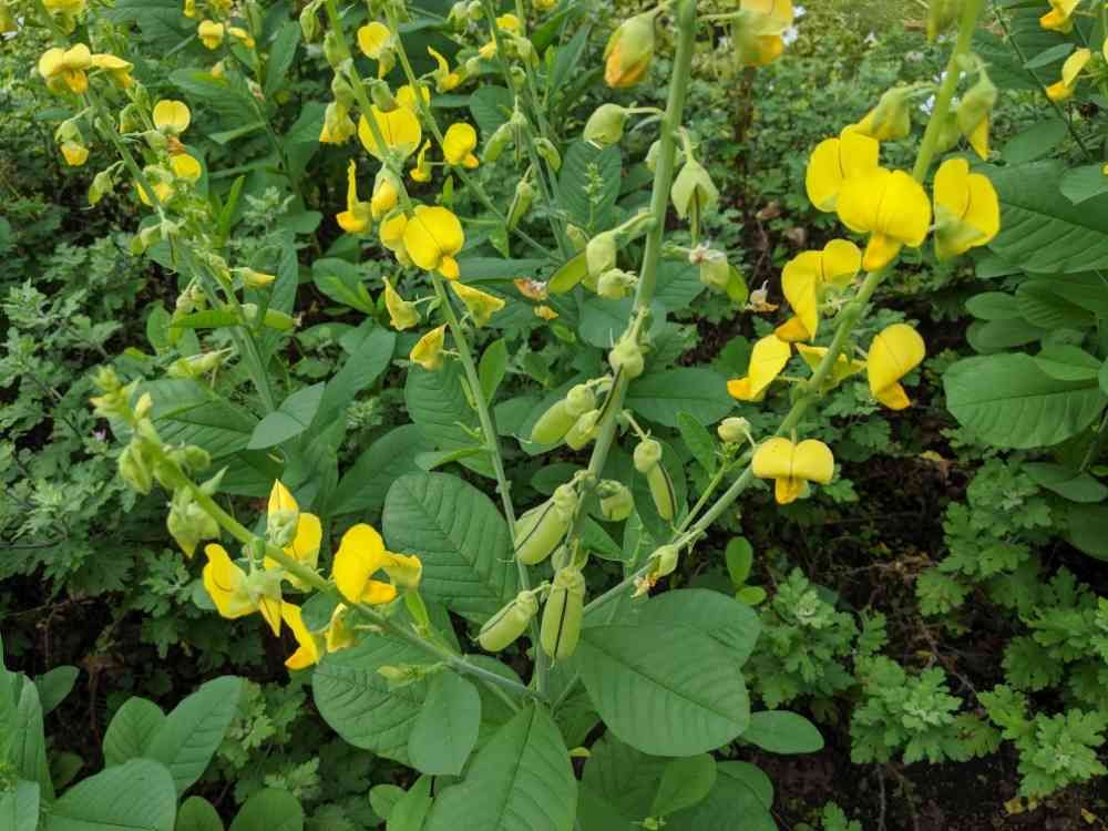 サンヘンプ(Sunhemp)は直立した茎から枝がたくさん出てその先に蝶形をした黄色い小花から成る総状花を咲かせるマメ科タヌキマメ属の一年草。