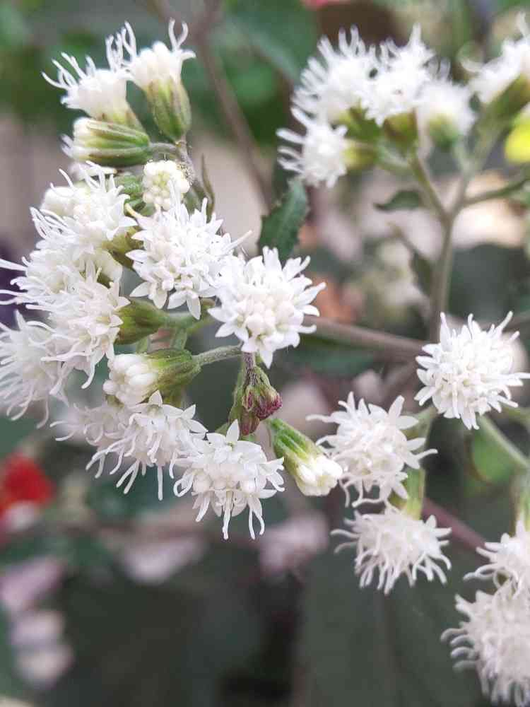 寄せ植えの中のユーパトリウムチョコラータが白いお花を咲かせ始めました♪