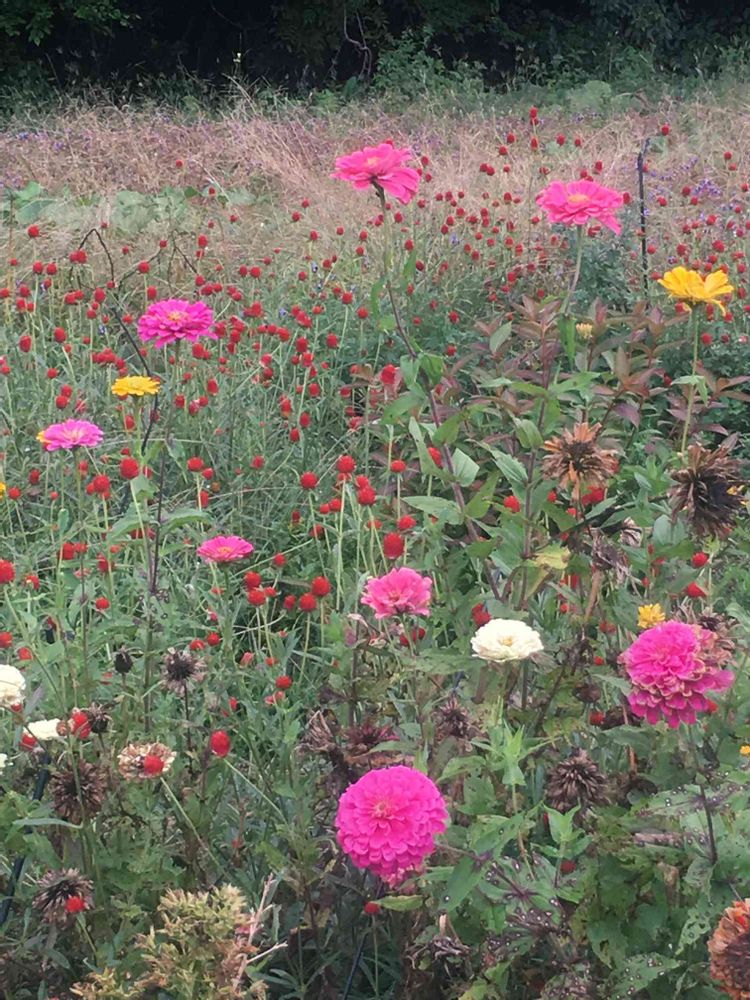 お花畑。夏から引き続きで咲いてるんじゃないかと思いますが、少しまばらなヒャクニチソウのせいもあって?秋の寂寥感が漂います。