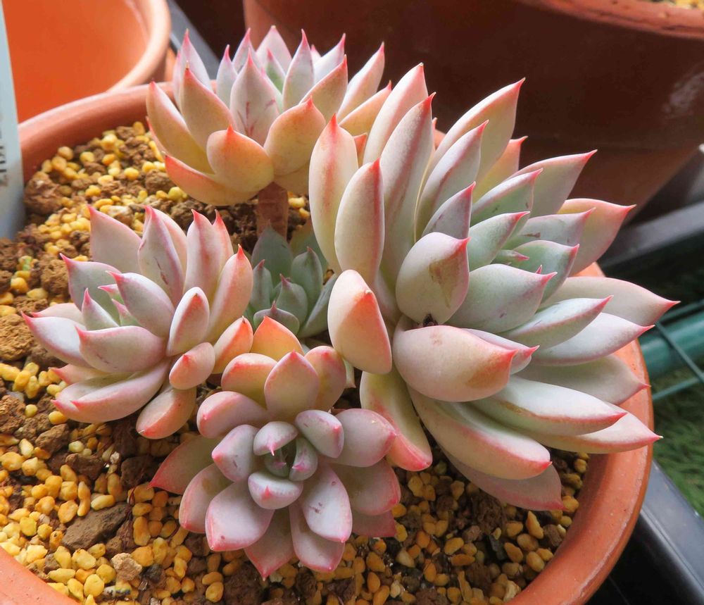 遮光ネットをはずしてからニバリスの紅葉が急に進んだ。爪が一斉に赤くなっていい感じに。根元から出てきた真ん中の子株だけ青いのも目を引く。