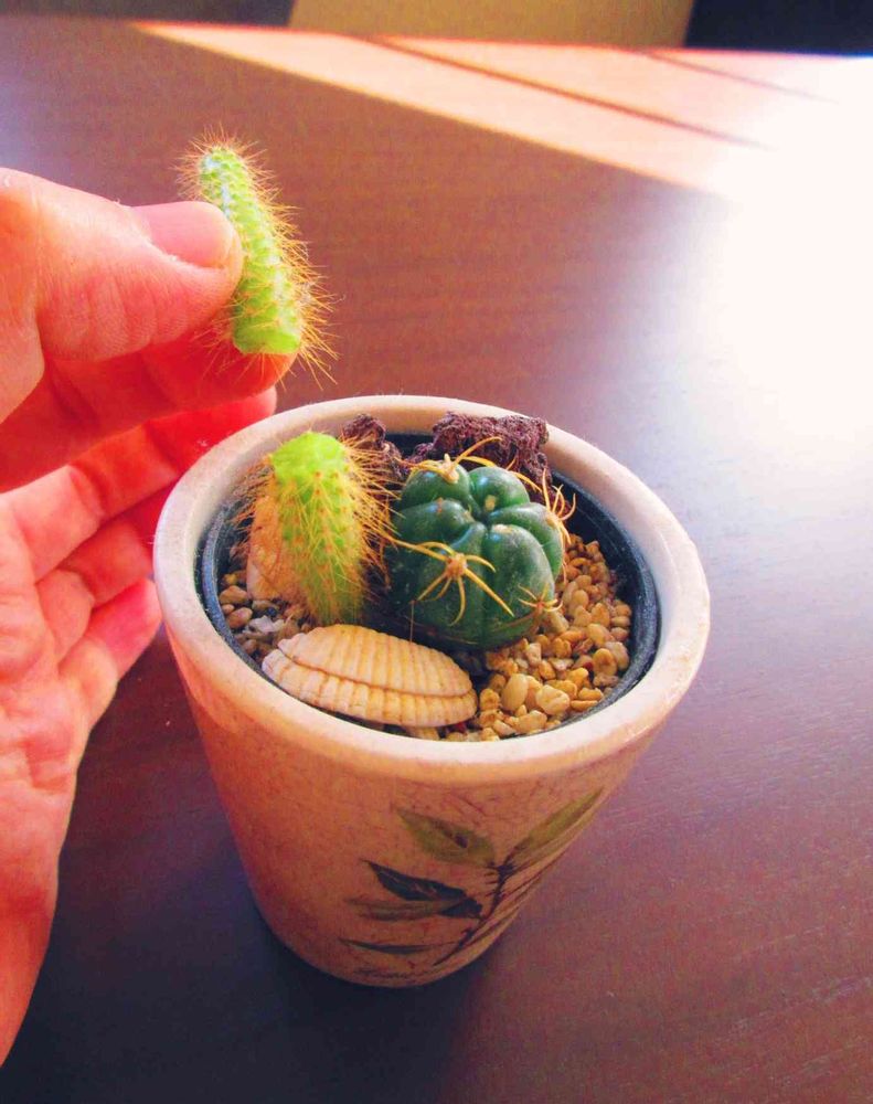 白いのは貝殻です。白い砂はサンゴの砂らしいです。植木鉢は穴のない鉢カバーのようだったので、多肉の苗が植わっていたプラ鉢に植えて、底に水が溜まっても根腐れしないようにペットボトルのキャップで底を浮かせて鉢カバーにぴったりの高さに入れています。