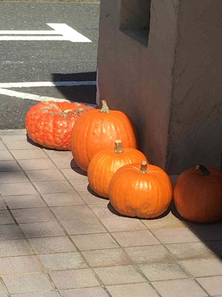 パンプキンたち。洋菓子屋さんの玄関前に置いてあります。見るだけで 食べられません。