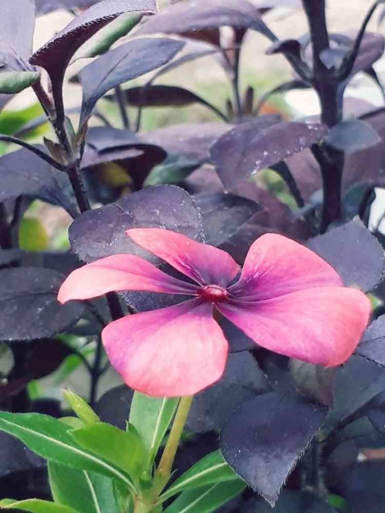 待て待て、ニチニチソウもシックで素敵だけど、後ろの銅葉は何?