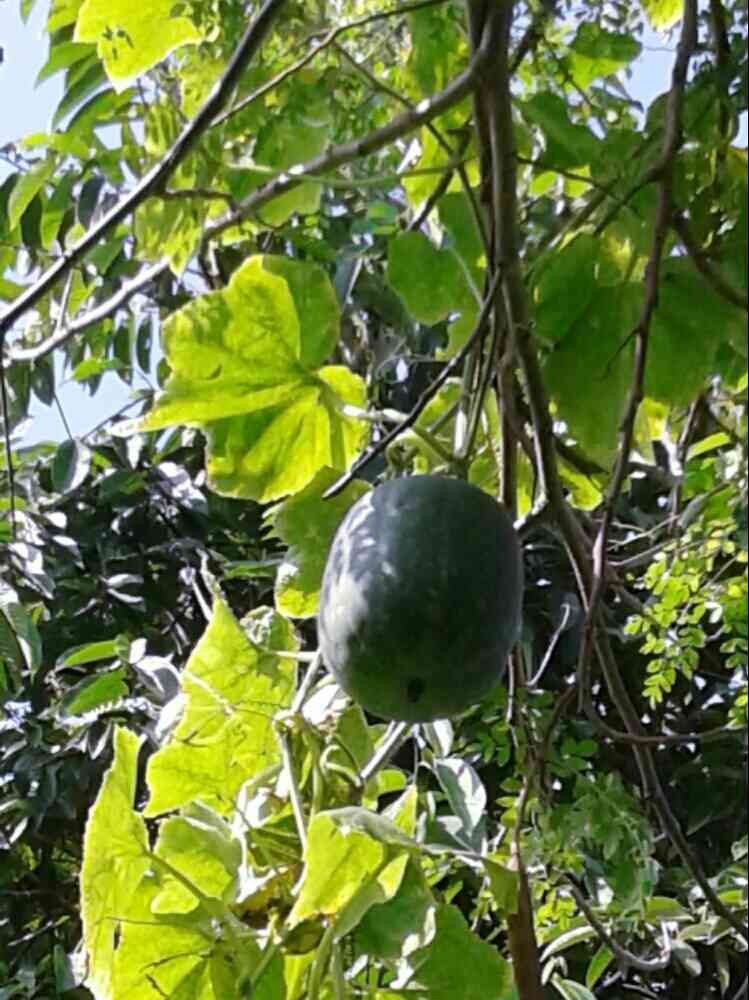 お隣さんの冬瓜(トウガン)が我が家のワサビノキ(モリンガ)に展着。お隣さんは勝手に採って食べていいと言っていますが、場所は高さ約5m。材質が極端に柔らかい木なので、登るのも太枝に梯子を掛けるのも危険。さてどうしたものか。