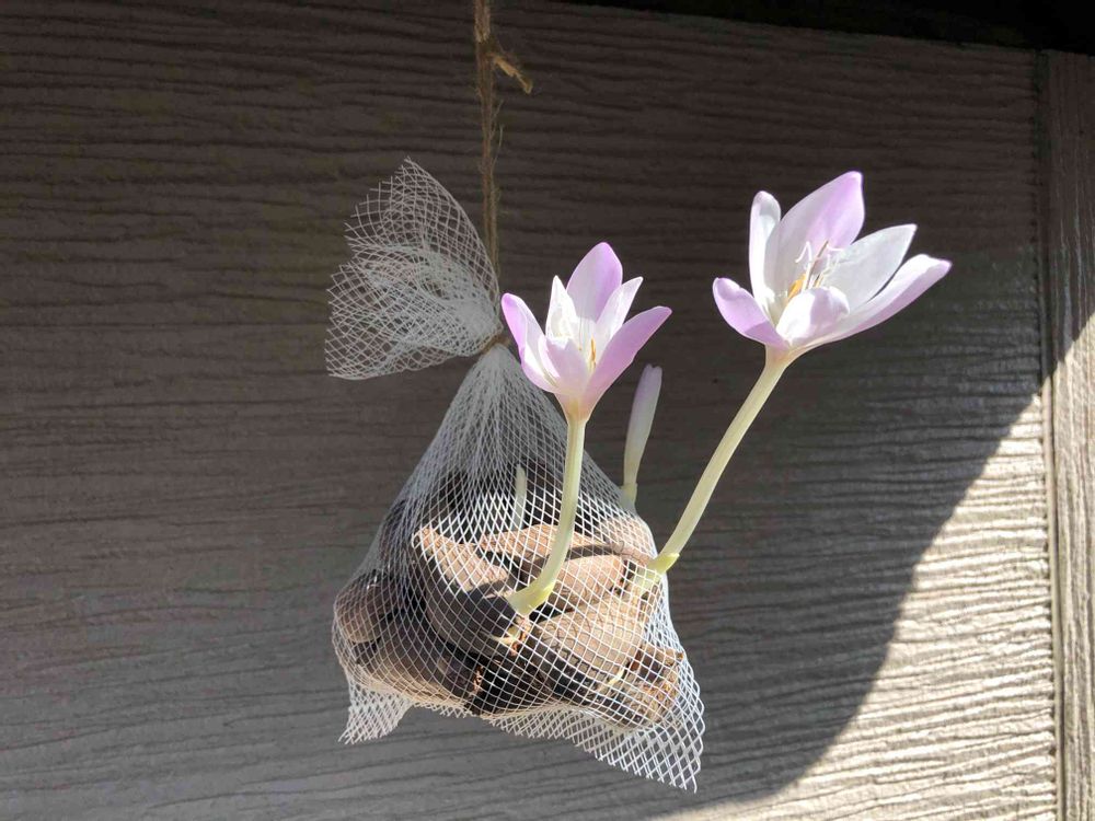 軒下につるしておいたネットから イヌサフランの花が🌸
