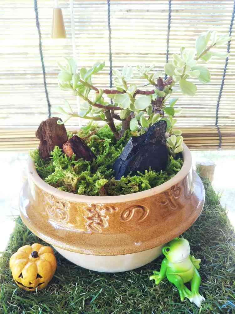 もうひとつ穴を開けてあった釜めしの器はしばらくは何も植える予定がなかったのですが、勢いでこんな和風な感じで作ってみました。