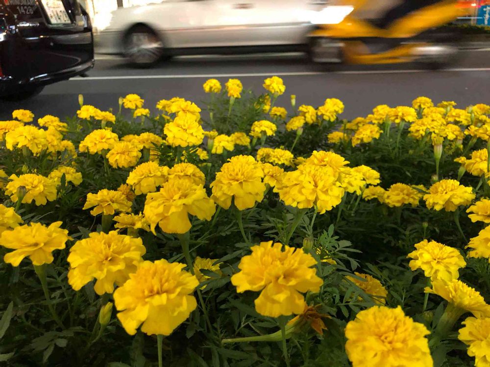 東京の日本橋、中央通は黄色、橙色のフレンチマリーゴールドで埋め尽くされました。2kmくらいあるかな?車に負けじと咲き誇ってます。