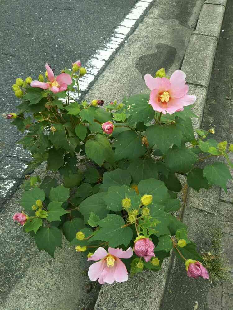 コンクリートのすき間から、いろんな花が咲いてるのを見ましたが、フヨウは初めてです