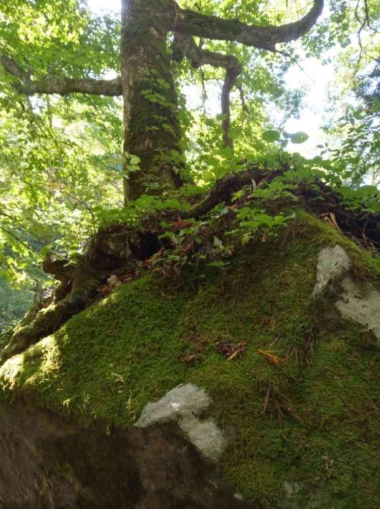 苔蒸した岩を抱くように巨木が生えています🌳