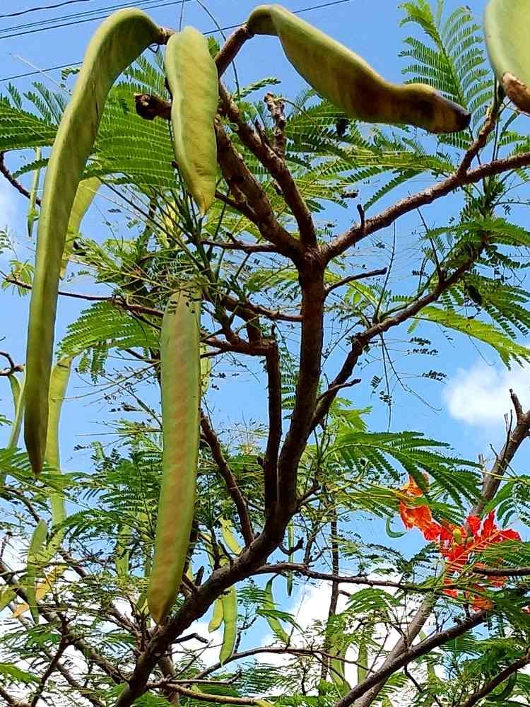 ショッピングセンターの横の火炎樹!この前の台風でボロボロになっていたのに、こんなに回復して、豆まで出来ていましたー❤