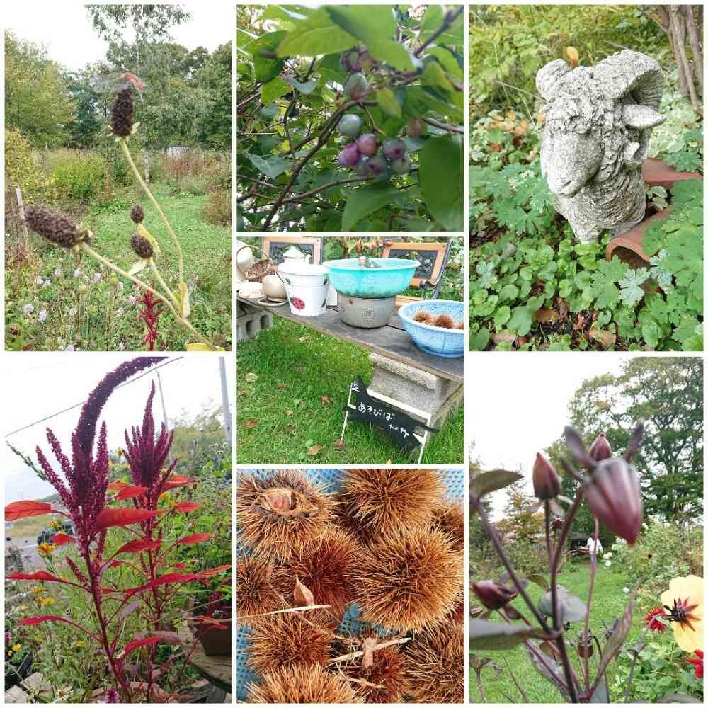 野原のような広~い庭は 花が終わってしまっているのが多かったけど それもまた風情があったゎ♡子ども用に遊び場が…ザルに栗が入ってたイガイガ🌰