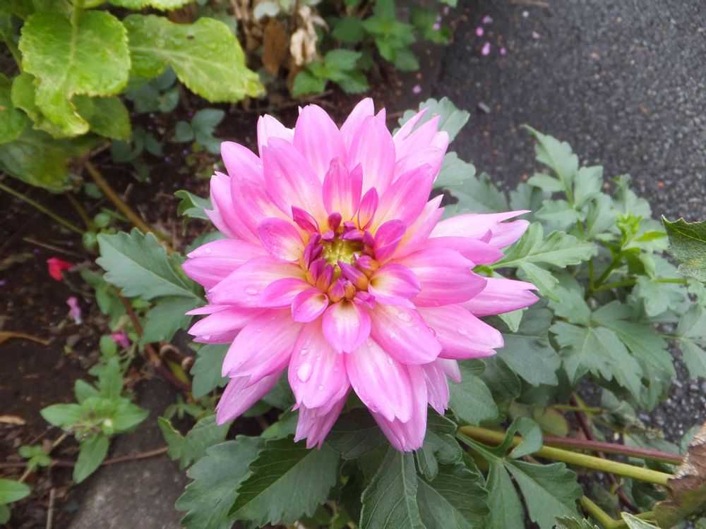 歩道に倒れた茎から綺麗なダリア。 パチリ