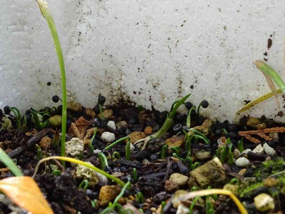 2018年の8月に蒔いた行者ニンニクの種が1年2ヶ月越しに発芽した。