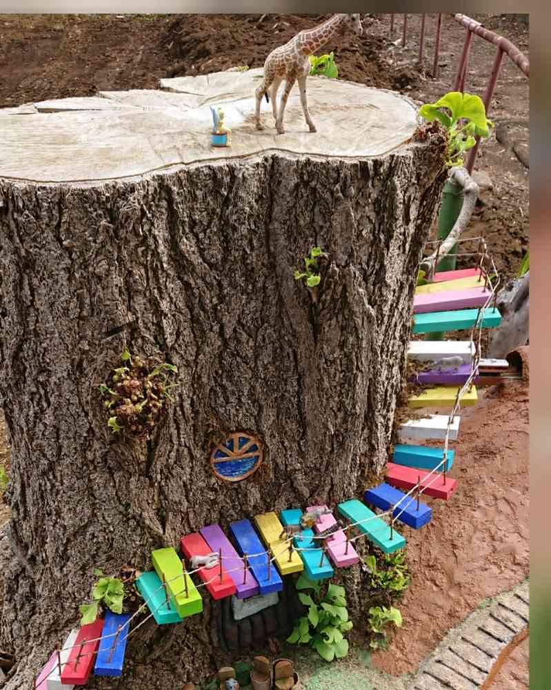 銀杏の切り株から芽🌱が出て来ているとこも階段の色が色々違う色合いも切り株の上のキリンさん🦒と天使🧚🏻もそこだけで、もう物語が始まりそうな素敵picですね〜!有難うございました!😍💕💕