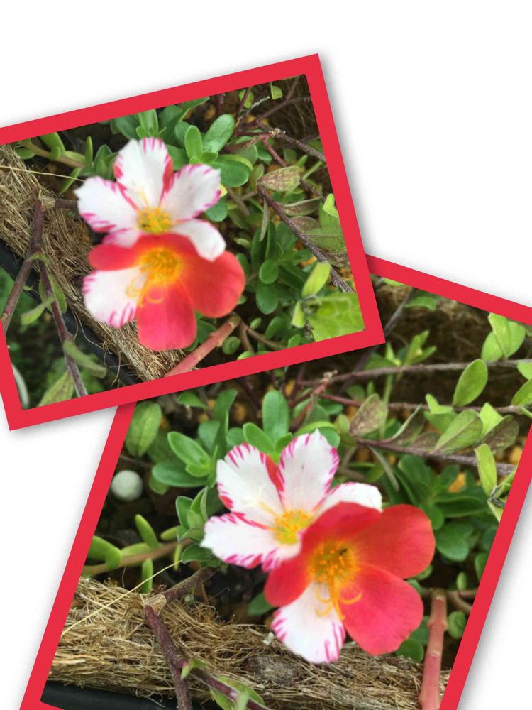 これはポーチュラカの絞りざきがなぜか一本から双子ちゃんができて、赤のポーチュラカがまざってる?