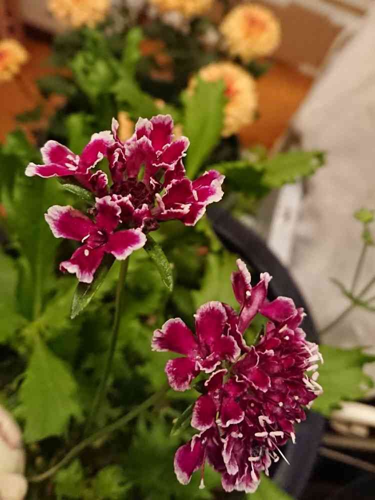 我が家は家の中にしまえる鉢数が、限られているので鉢植えの菊を5鉢とスカビオサを1鉢玄関内に入れただけです♬.*゚