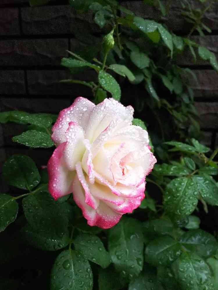 台風の中、ひときわ綺麗に咲いていました。薔薇の花って水滴も似合う花なんですね😚💕