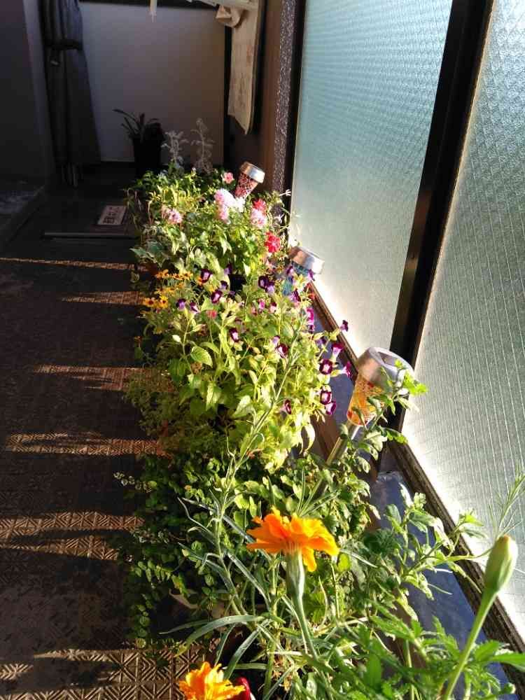 ベランダの足元に、沢山の花々の間から差し込む柔らかな光…🌇🌸🌅🌷❁❀✿✾
