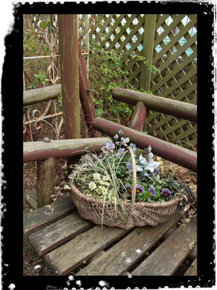 庭の木製ブランコは、ほとんどベンチがわりなので、こんな風に寄せ植えを置くことが多いです♪