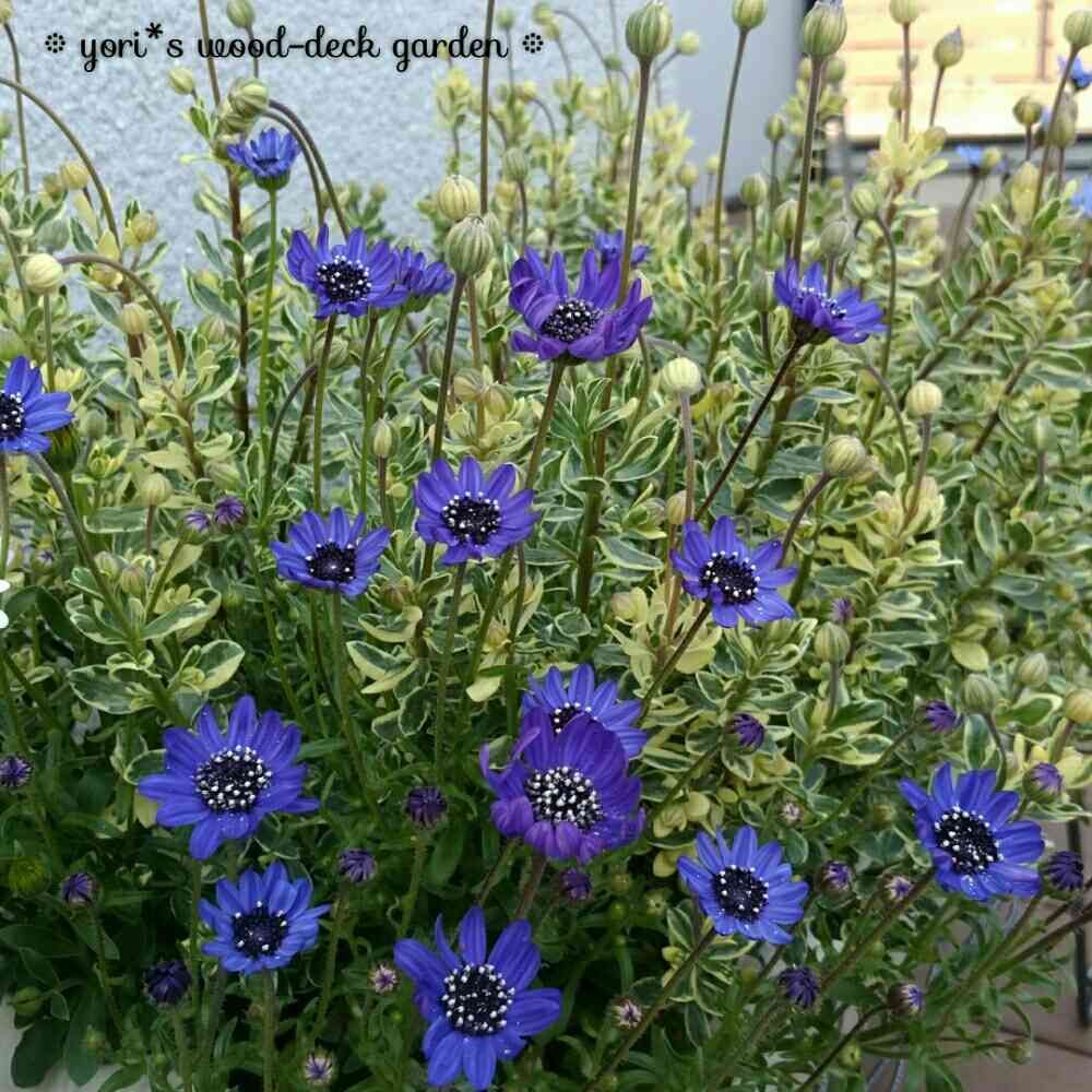 バックの斑入り葉と蕾は別のお花で、斑入りブルーデージー。フェリシアS•M“スプリング•メルヘン”のお花がよく映えるんですよ( ´艸`)💓