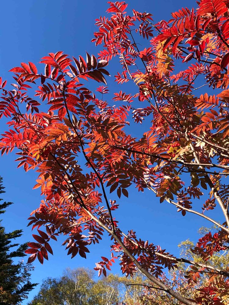 2週間前は、青々とした葉で、まだ全く色付きを感じさせなかった、奥日光湯元の「ナナカマド」の葉が、10/13日に伺った時には、陽当たりの良いところの葉ほど、真っ赤な色に彩られ、赤い実もビッシリ付けて、輝きを魅せていました❗️