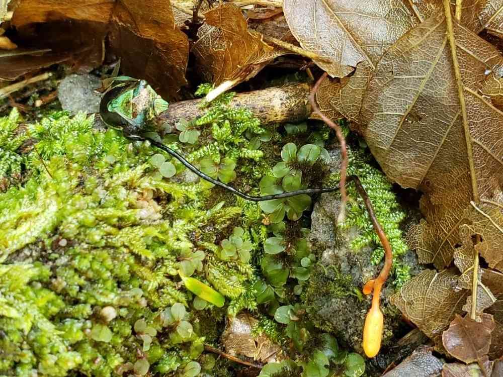 2回目に見つけたカメムシタケですが、このオレンジのきのこを目に焼き付けておくことですね。この時は、カメムシは苔に埋もれてました‼️