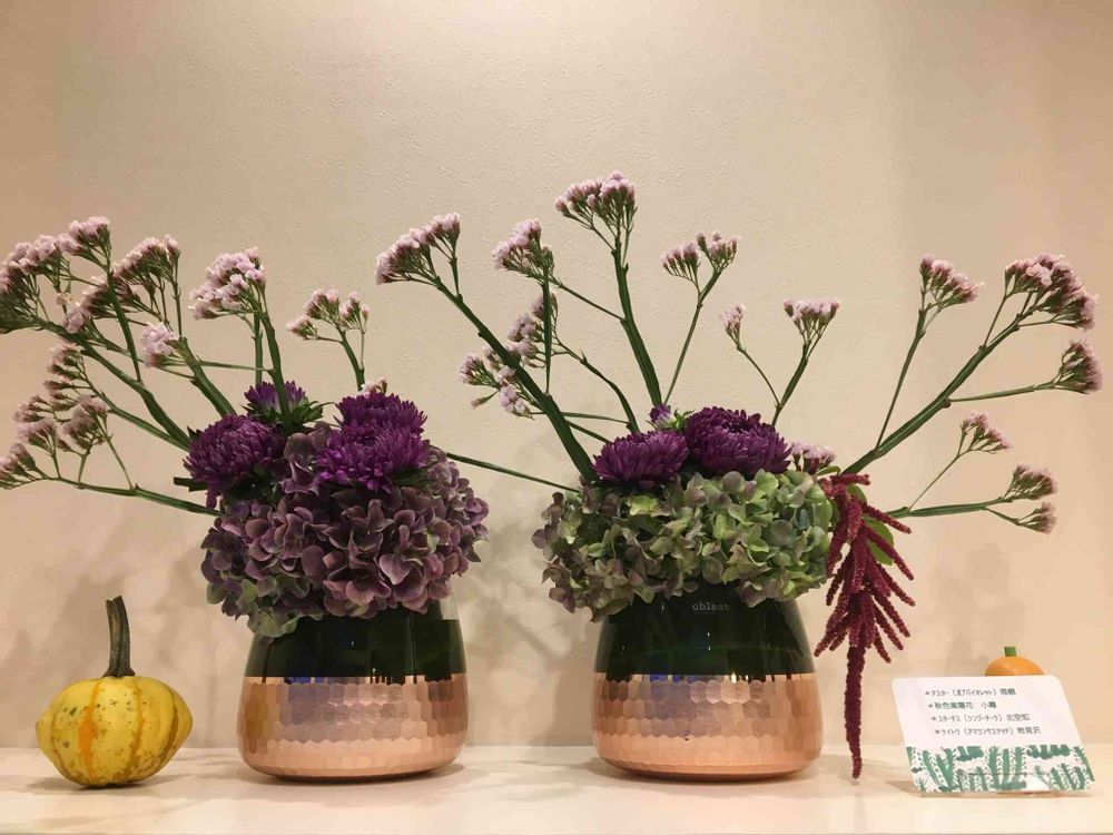 今週は深い紫色で渋めな感じで、これ又素敵デス!おっしゃる通り花器もその時々の生け込みに合わせたものになっています ♪
