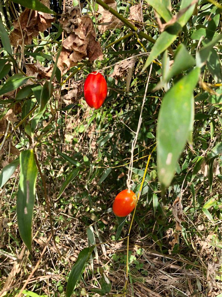 台風で倒れた竹をどかしたところ、カラスウリ?がまだ実ってました。