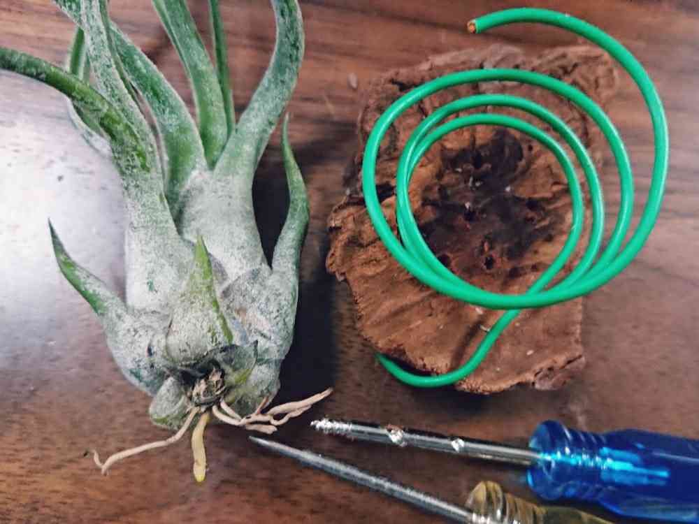 エアプランツに根っこ出て来て、着生させたくて穴をバークに開けて見ました🤗