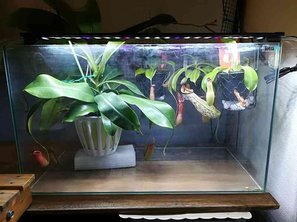 水槽60×45×45をネペンテスの為実家からかっぱらって来ました。ライト💡も点けてみましたが、左のレディラックが大きくはみ出して蓋が出来ません…😱どうしようかねぇー?😅