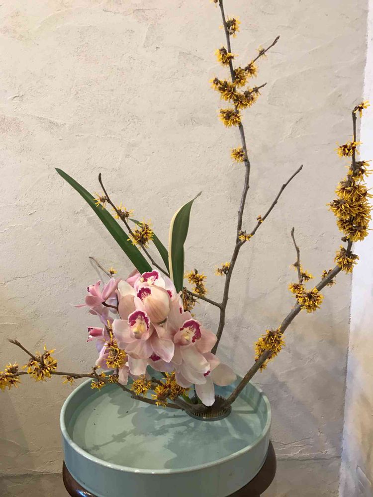万作の右からの流れを左で受け止めています。間にキキョウランを入れる事で作品全体に緊張感をもたせました。