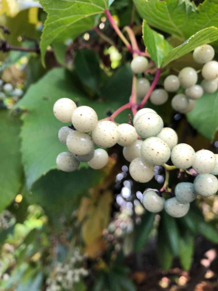 色が付いているノブドウは寄生虫が影響している寄生果で、白が元々のノブドウの色だそうです。