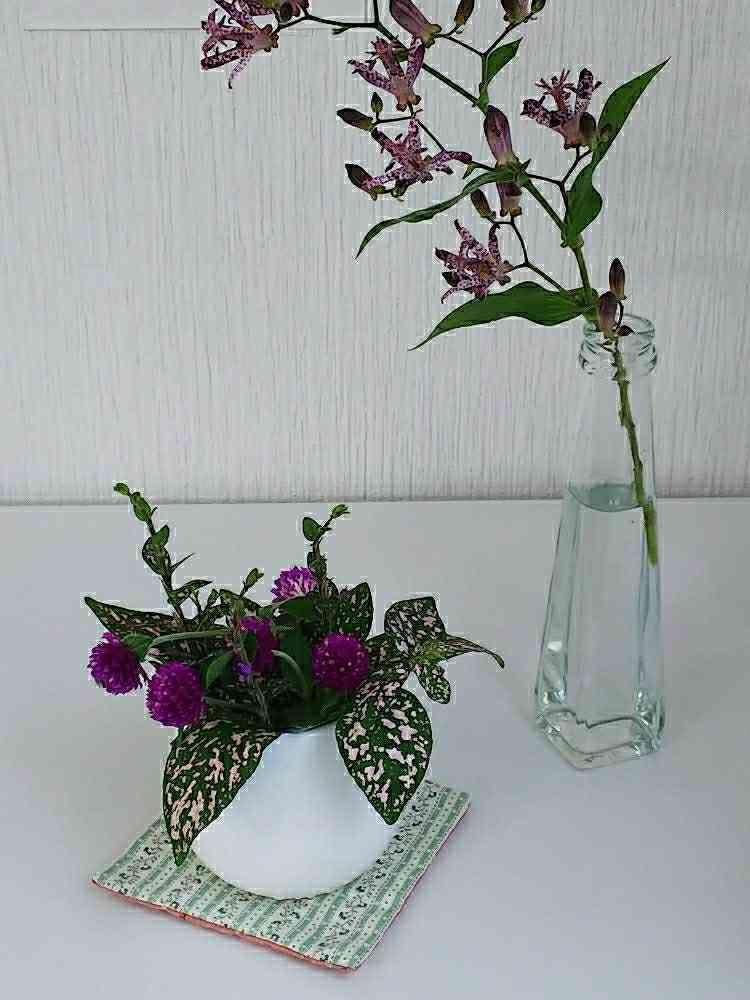 デイサービス今日の卓上花は先日のホトトギスがまだ元気だったので一輪挿しにし、千日紅とヒポエステスが仲間入り