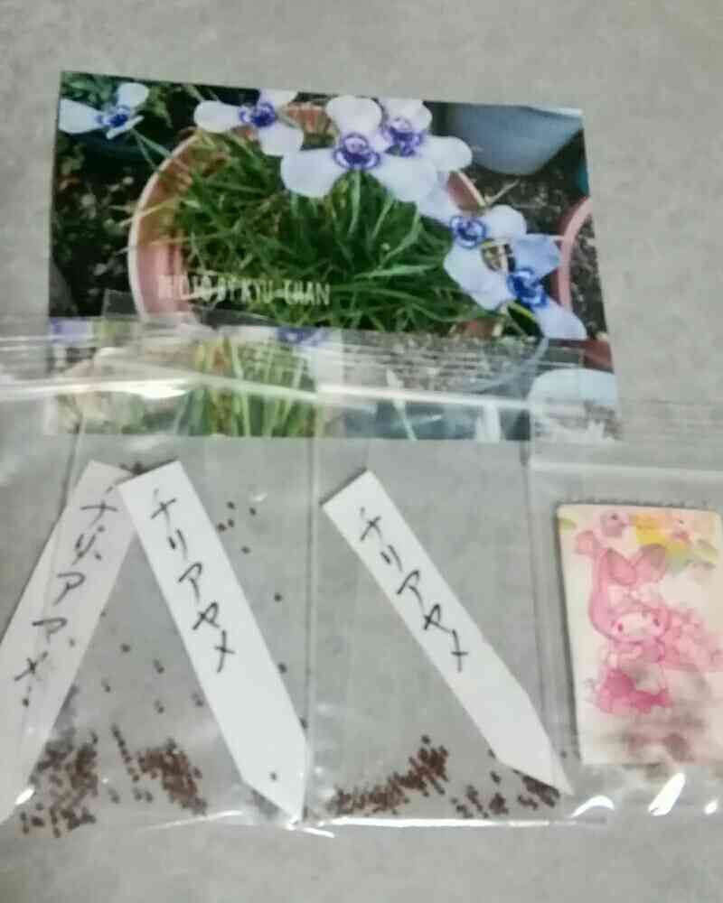 以前きゅうちゃんにチリアヤメの写真見せてもらって可愛いしほったらかしで育つと聞いてたのですがちゃんと覚えてくれてて種とお花の写真付きで送って頂きました🙌