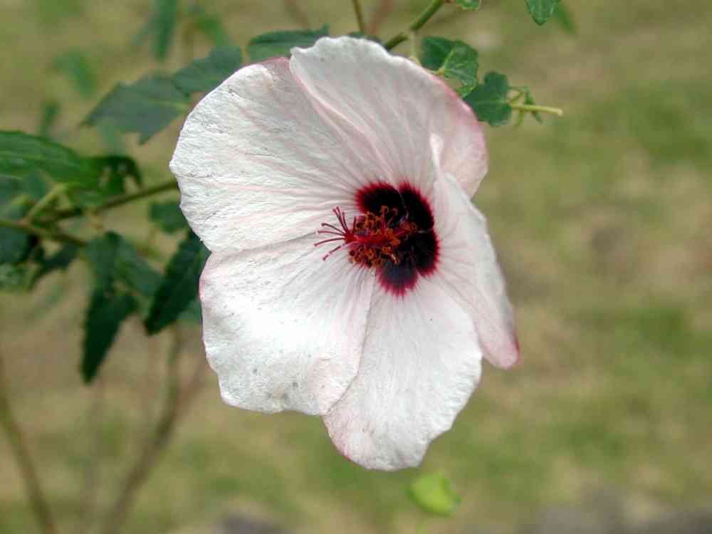花期は7~10月ごろ、花の色は 白で中心部が濃赤褐色、花径4~6cm、草丈100cmほど。