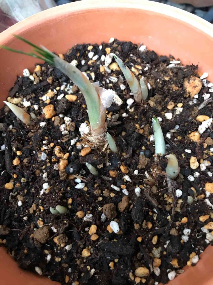 5球でたしか398円→100円に値下がっていたサフラン 。芽が出てきました。もともと1球は芽が出ていたけど😅
