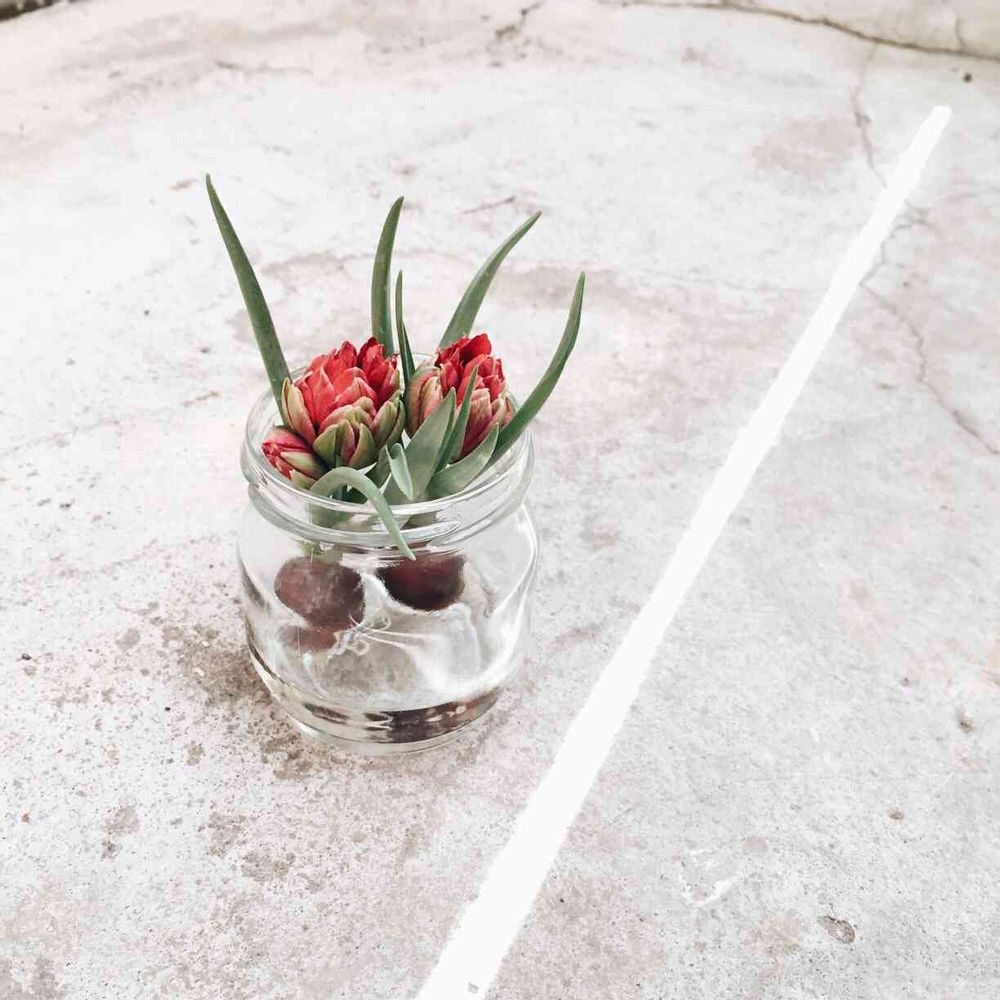 アトリエの原種チューリップちゃんたち。とりあえず鮭フレークが入ってた瓶で栽培中。