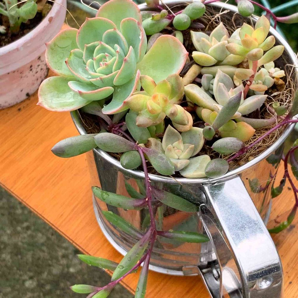 子どもが小さいときは毎日のようにおやつにケーキやクッキーを焼いていて、思い出深く捨てられず…底が網なので、これは植えるしかない!って。こうやって我が家はガラクタが減らないのです。笑笑