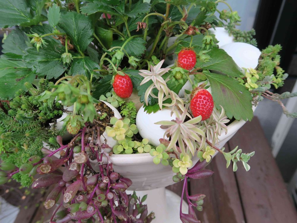 9月に投稿していた寄せ植えの四季なりイチゴが、10月になってやっと食べ頃になりました