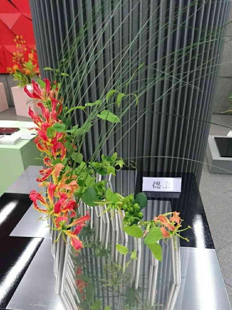 赤いグロリオサを丈の違う細い花器に入れて並べたシンプルだけどインパクトある生け花には「偲ぶ」というタイトル