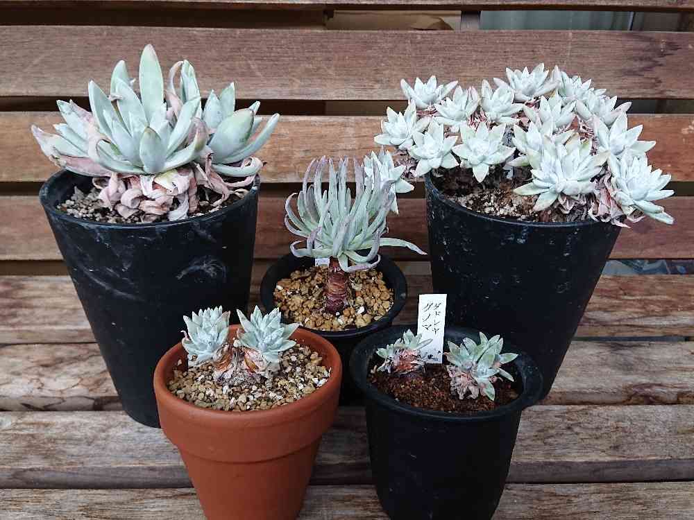 ベンケイソウ科ダドレアちゃんたち、左上から時計回りに、キャンディダ、ヴィレンス ハッセイ、グノマ、グノマ、グリーニー。以前も書いた気がするけど、未だにグノマとグリーニーの違いがよくわかりません。両方かわいいのでどっちでもいいんですけど。はたして、小さな弟3人は立派な2人の兄たちくらいに大きくなるのでしょうか。乞うご期待✨