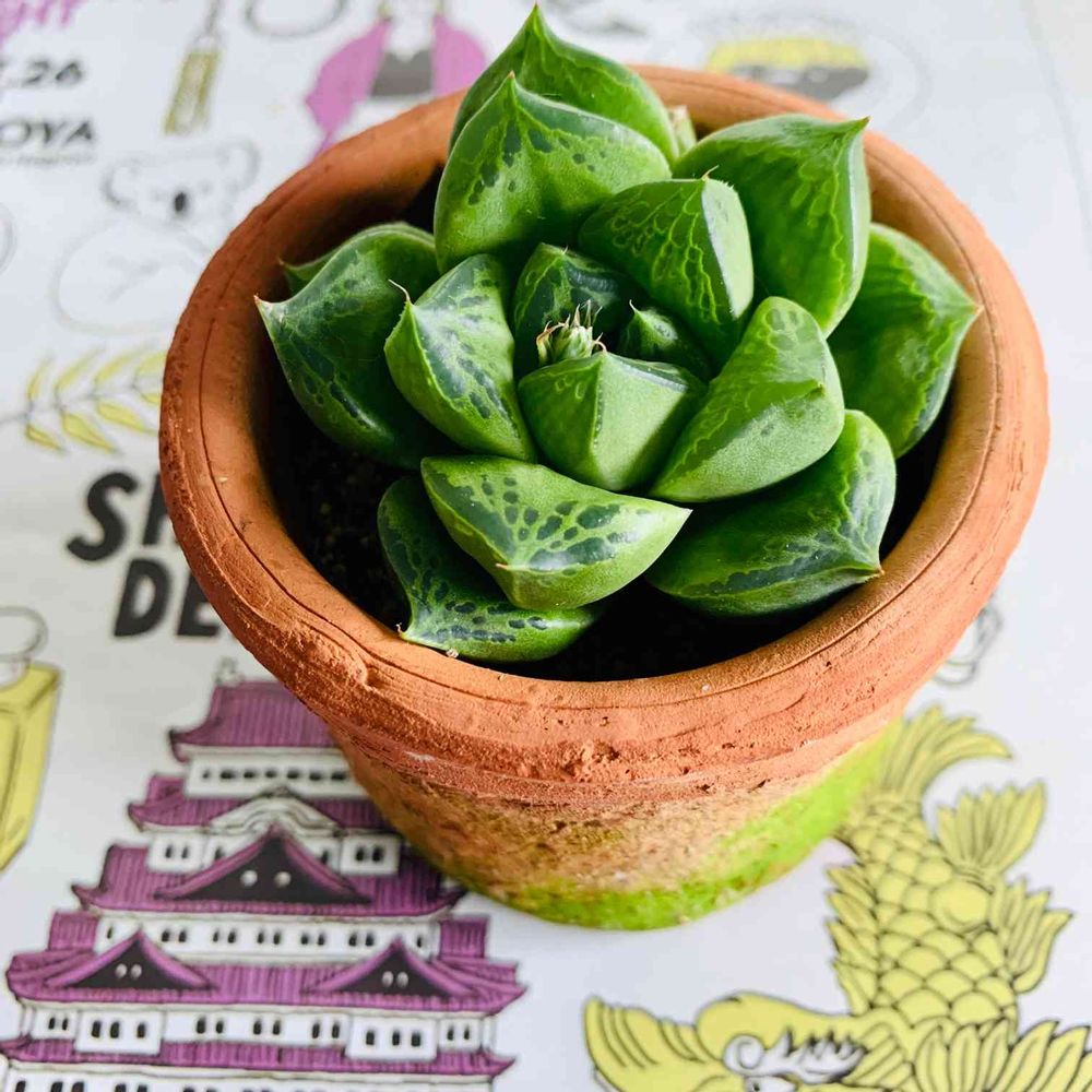 植木鉢みたいに苔生した緑色でぷくぷくの肉厚なハオルチアです。